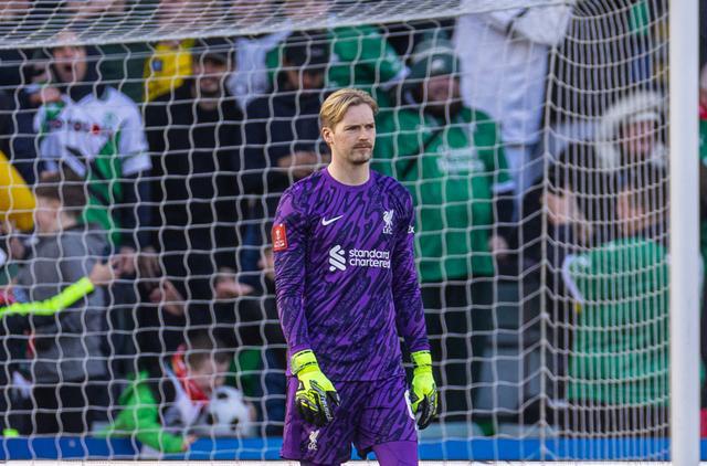2025年2月9日,利物浦队门将凯莱赫在普利茅斯队球员哈迪点球破门后神情沮丧。 当日,在2024-2025赛季英格兰足总杯第四轮比赛中,利物浦队客场0比1不敌普利茅斯队。 新华社发