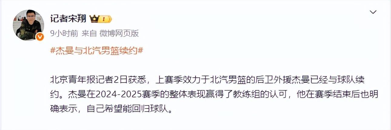北京男篮也开始了外援方面的操作,据体育记者宋翔透露,球队已经和小外援杰曼完成了续约,另外还将签下大外援斯佩尔曼。杰曼上个赛季的表现非常不错,特别是季后赛阶段场均能够得到20.8分4.5个篮板8.1次助攻1.1次抢断的数据,是球队打入总决赛的功臣。虽然从表现和能力来看,杰曼和广厦男篮小外援布朗之间有些实力差距,他的表现也有些不太稳定,不过整体来说还是非常不错的。如果没有其他更好选择的话,北京男篮和杰曼续约还是非常正确的。